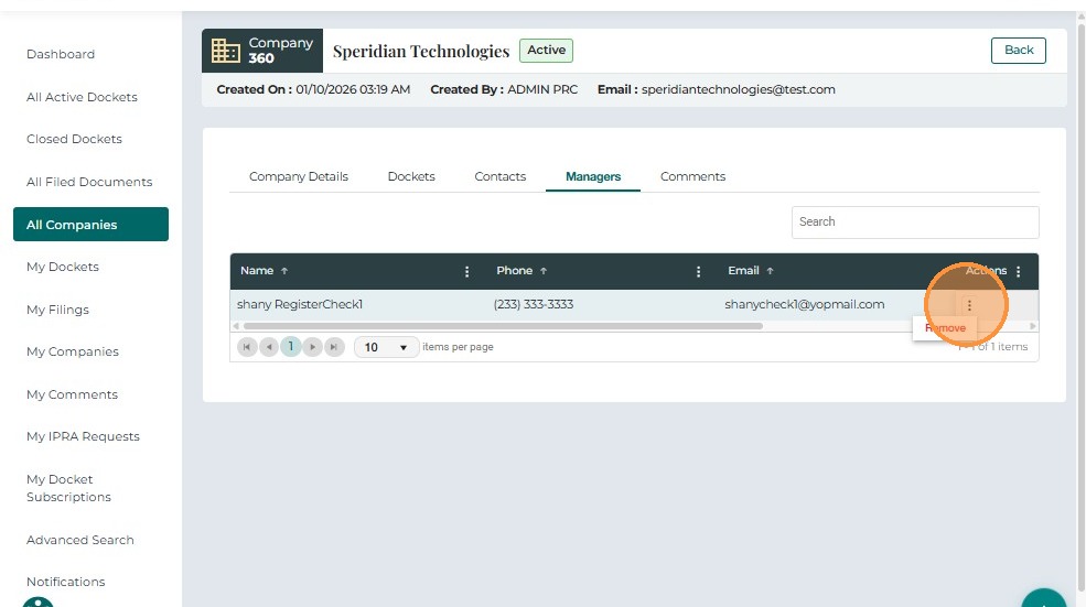 It includes details such as Docket Number, Filed Date, Filed By, and Company Name.
