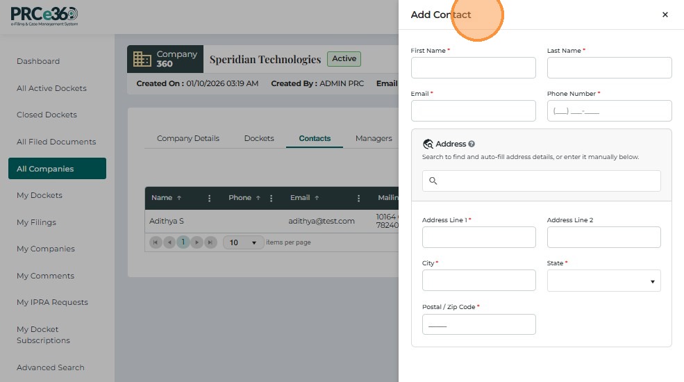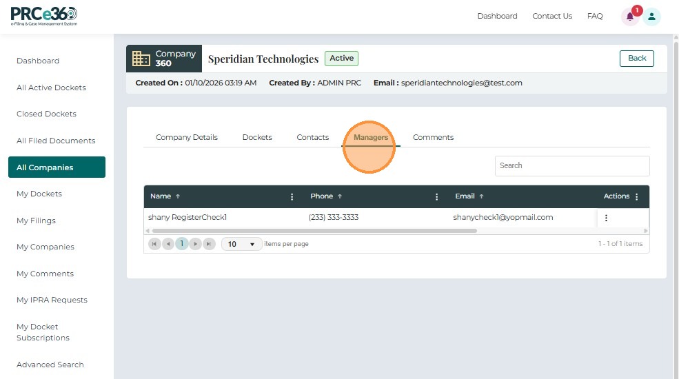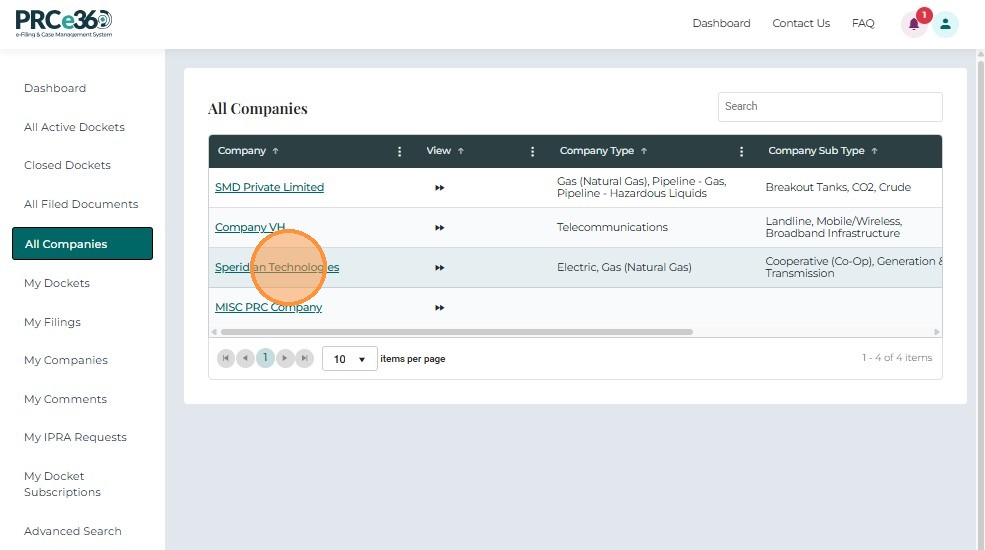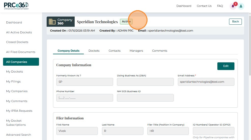 The Dockets tab within the Company 360 View lists all dockets filed by the company, displaying the Docket Number, Docket Type, and other related details.