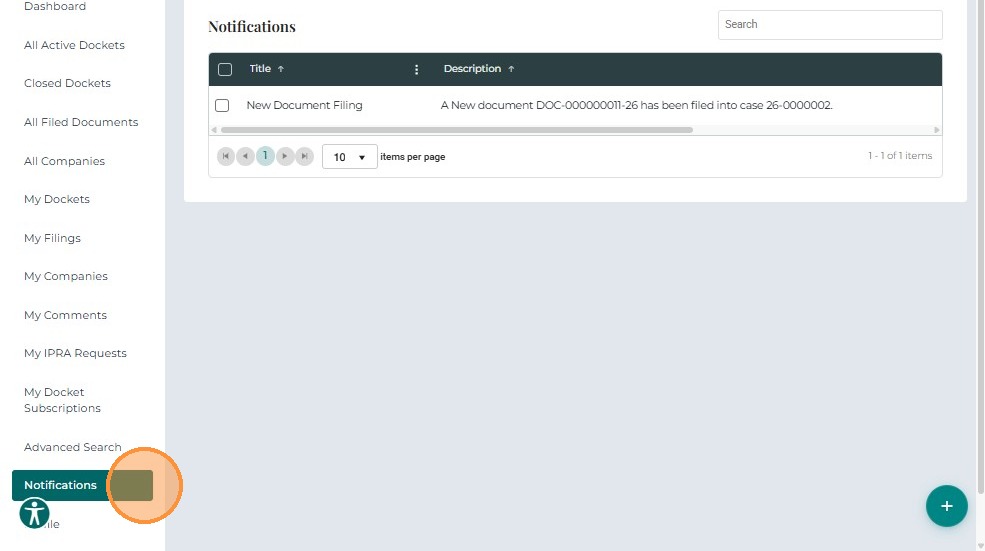 The Notifications screen allows users to view all system-generated alerts related to their subscribed Dockets.
