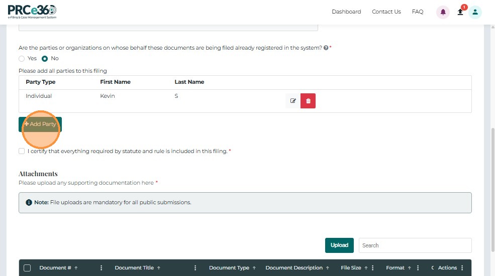 Note: If there is more than one party, click the +Add Party button to include additional party information.
