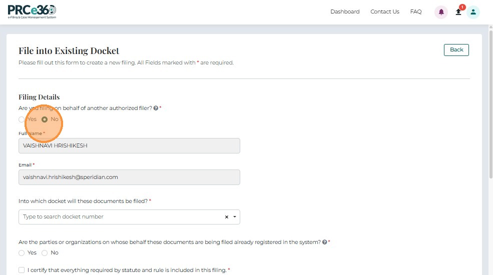 Radio buttons (Yes / No) allow users to specify whether they are submitting on behalf of another filer. -