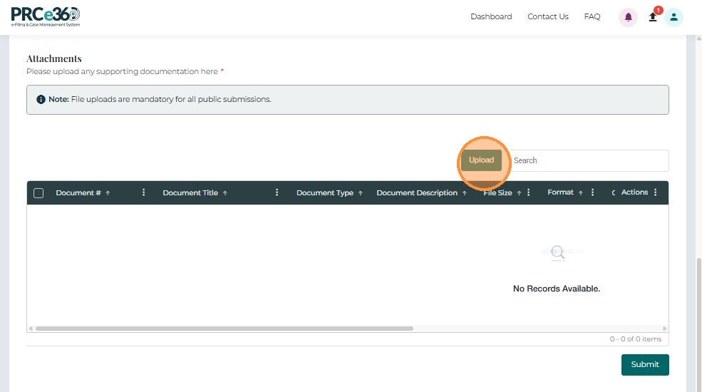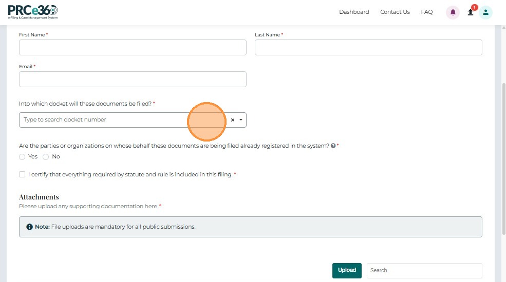 After completing all required fields and uploading documents, click Submit to file into the selected docket.