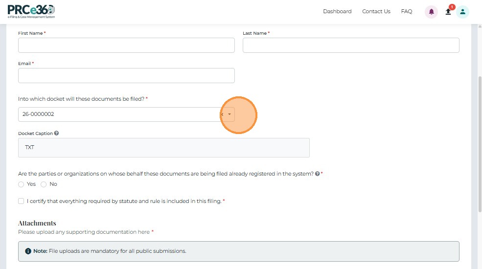 Search-enabled dropdown for selecting the docket number of the existing Docket. Once selected, the docket caption of the Docket will be displayed