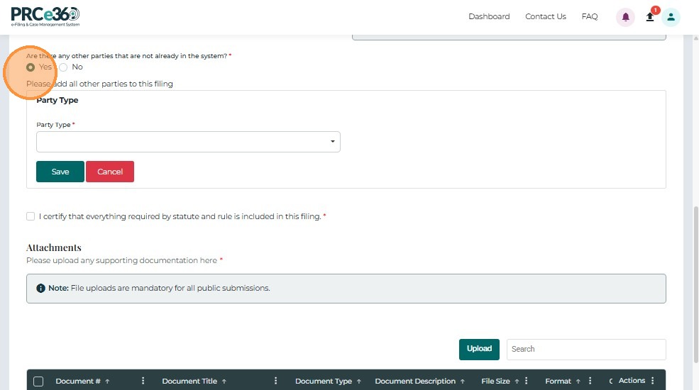 - Are there any other parties that are not already in the system? Radio buttons (Yes / No) control whether to manually enter new party details or continue the form.