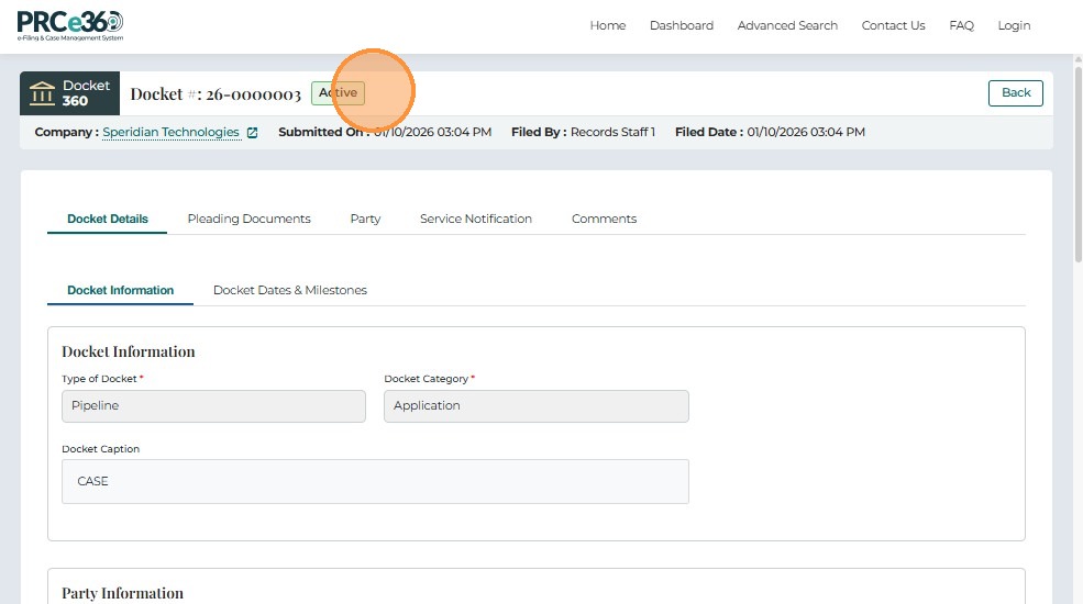 Case 360: The Docket ID is clickable. When clicked, the user is redirected to a Case 360 View with further tabs like Docket Details, Pleadings, Party, Service Notification, and Comments. The Case 360 top panel displays Docket Number, Status, Company, Filer Name, Date of Submission, and Filing.