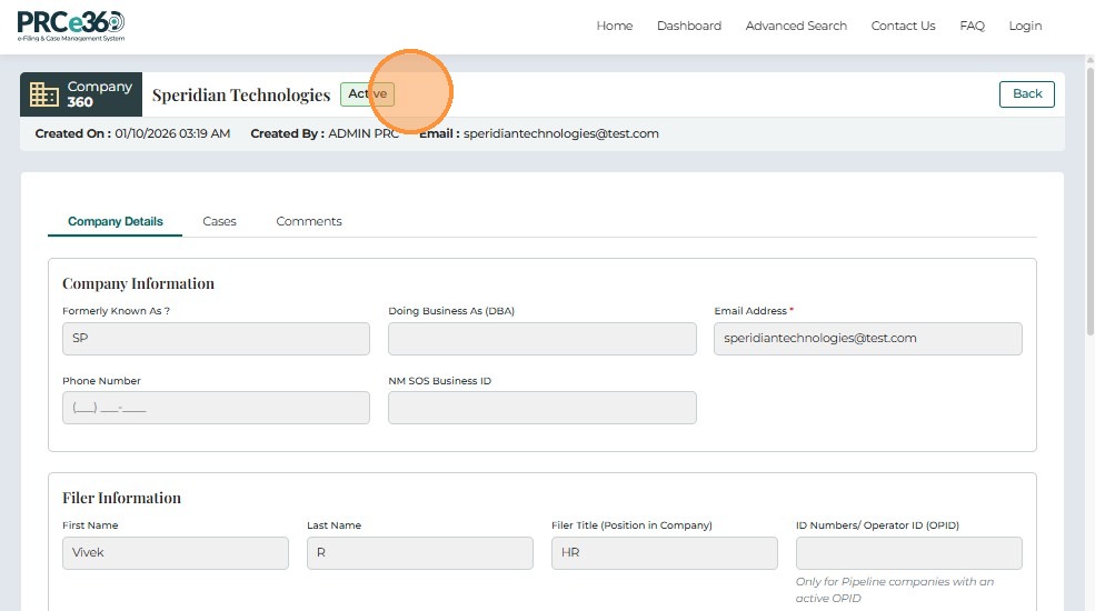 Company 360: The Company Name is clickable. Upon clicking, it opens up a 360 view of the company that includes Company Information in the Company Details tab, Dockets tab, and Comments tab.